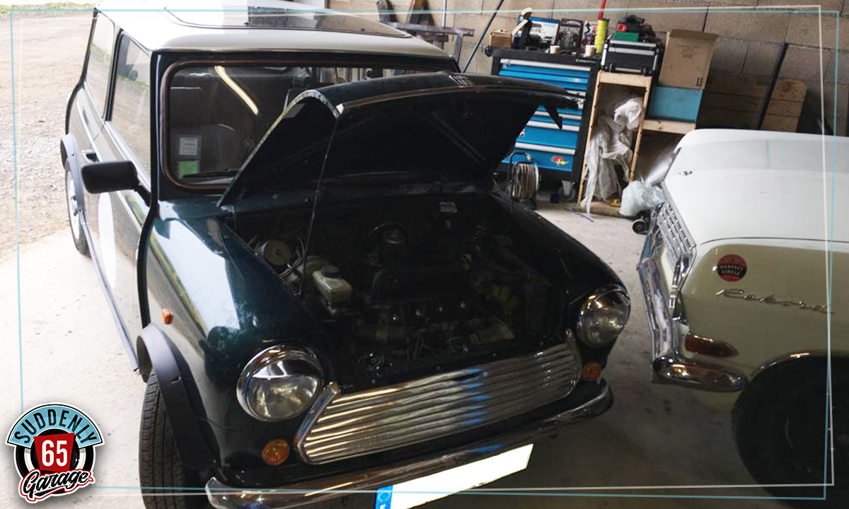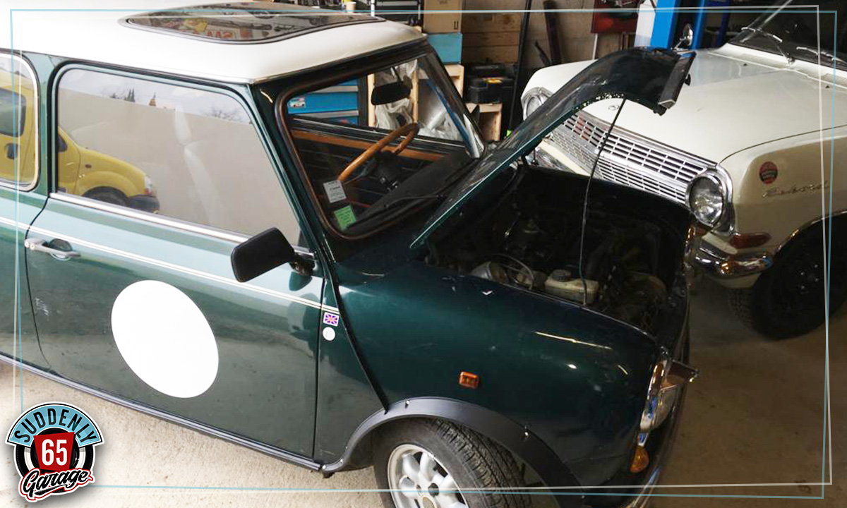 Une Mini de 1989 est à l'atelier pour un changement d'embrayage.