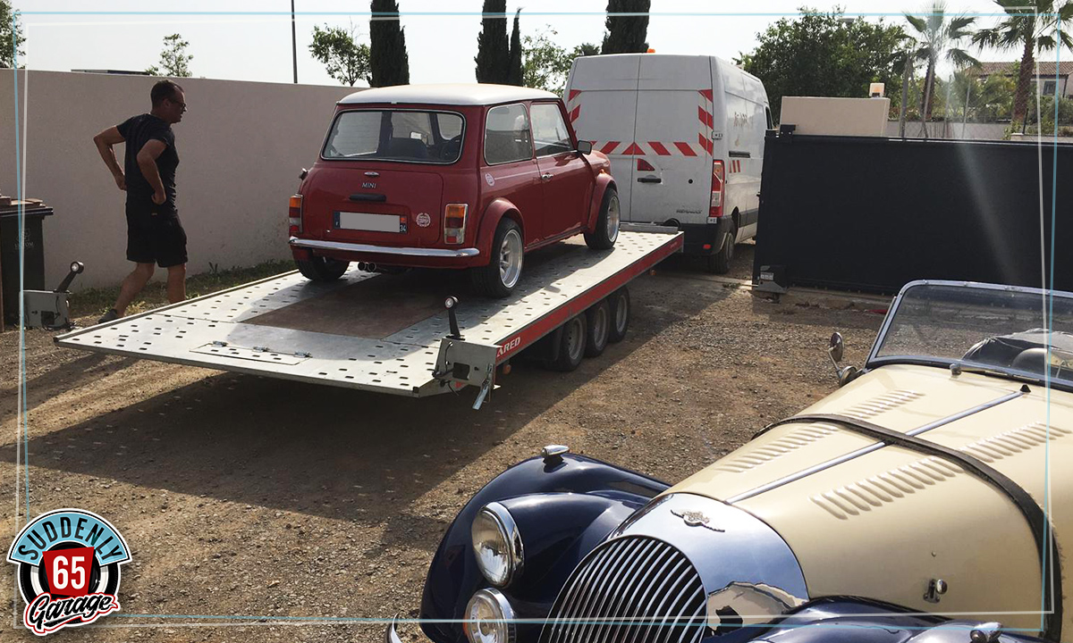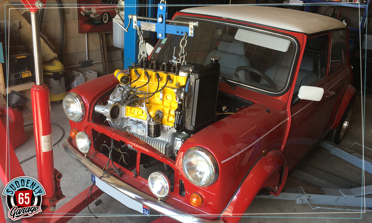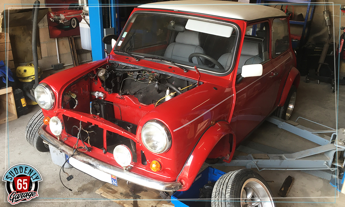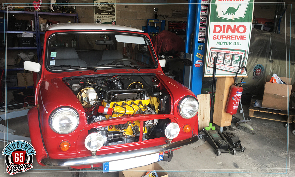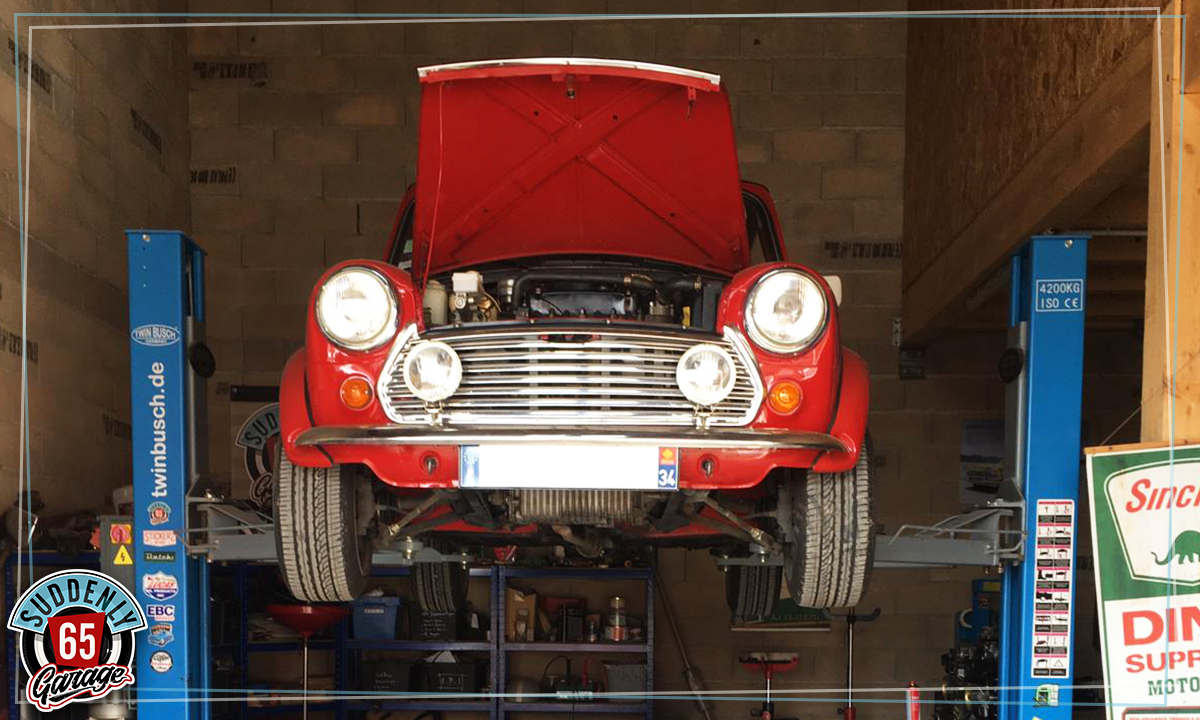 L'Austin Mini de Benjamin vient d'arriver à l'atelier en vue de remplacer l'embrayage.