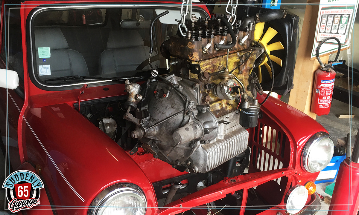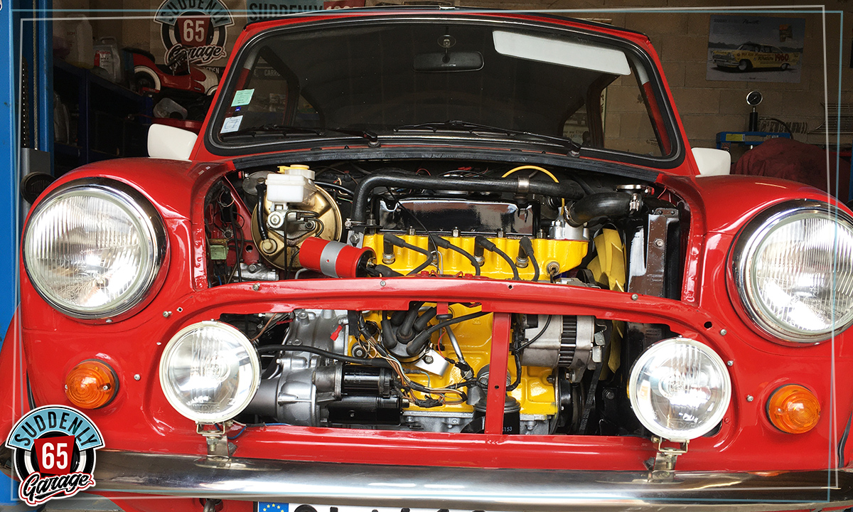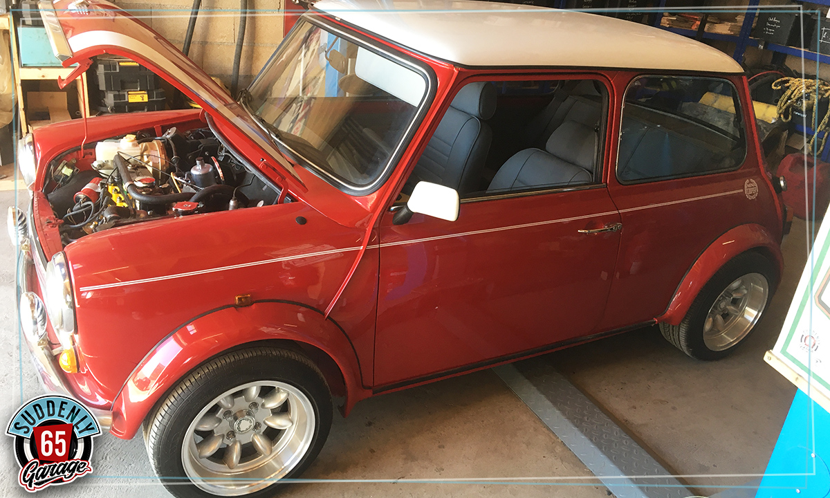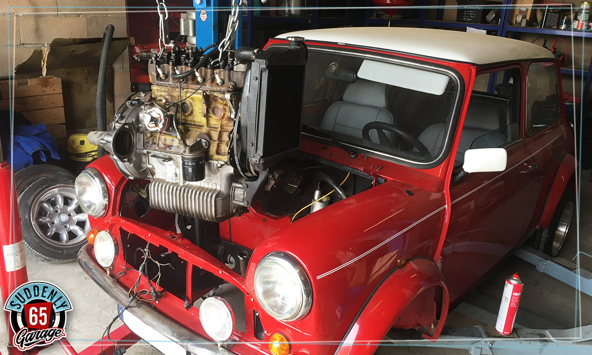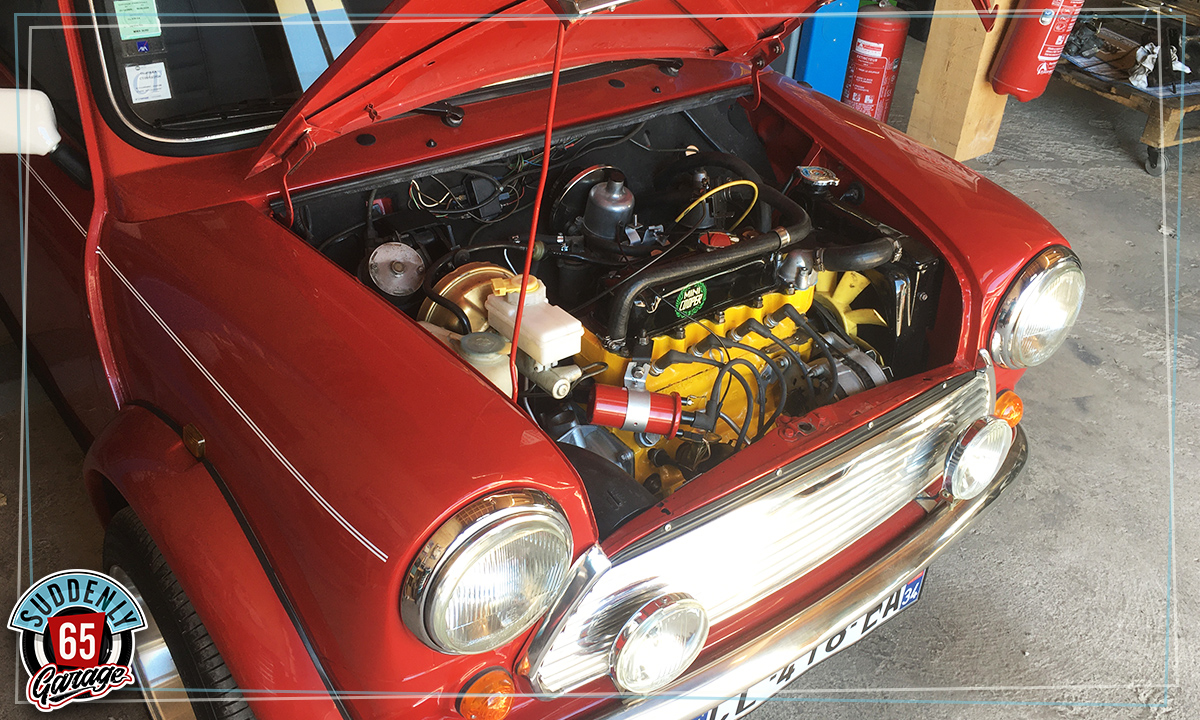 L'Austin Mini de Benjamin vient d'arriver à l'atelier en vue de remplacer l'embrayage.